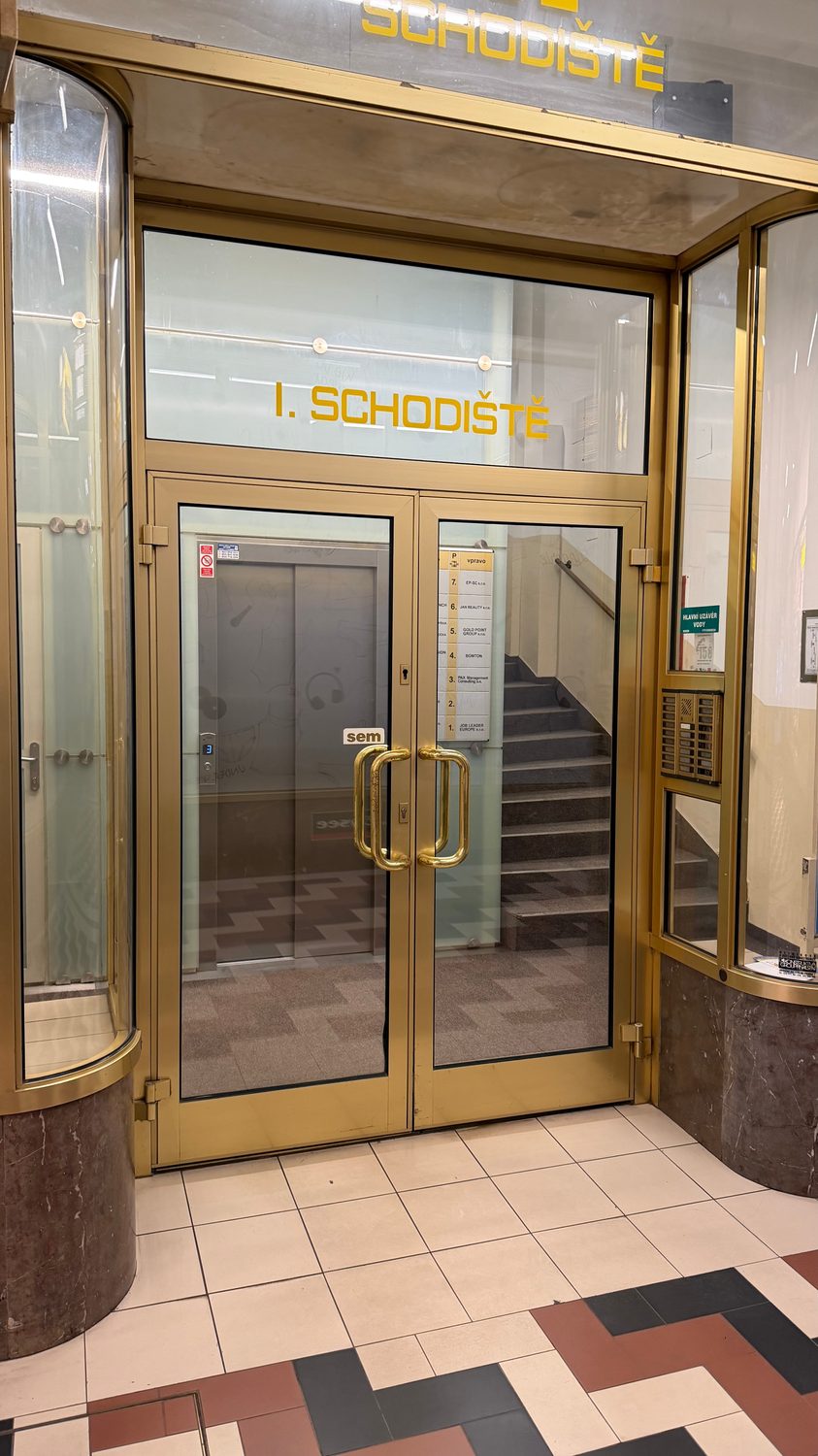 V pasáži po levé straně první schodiště, výtahem do 4. patra ( dveře Bomton)